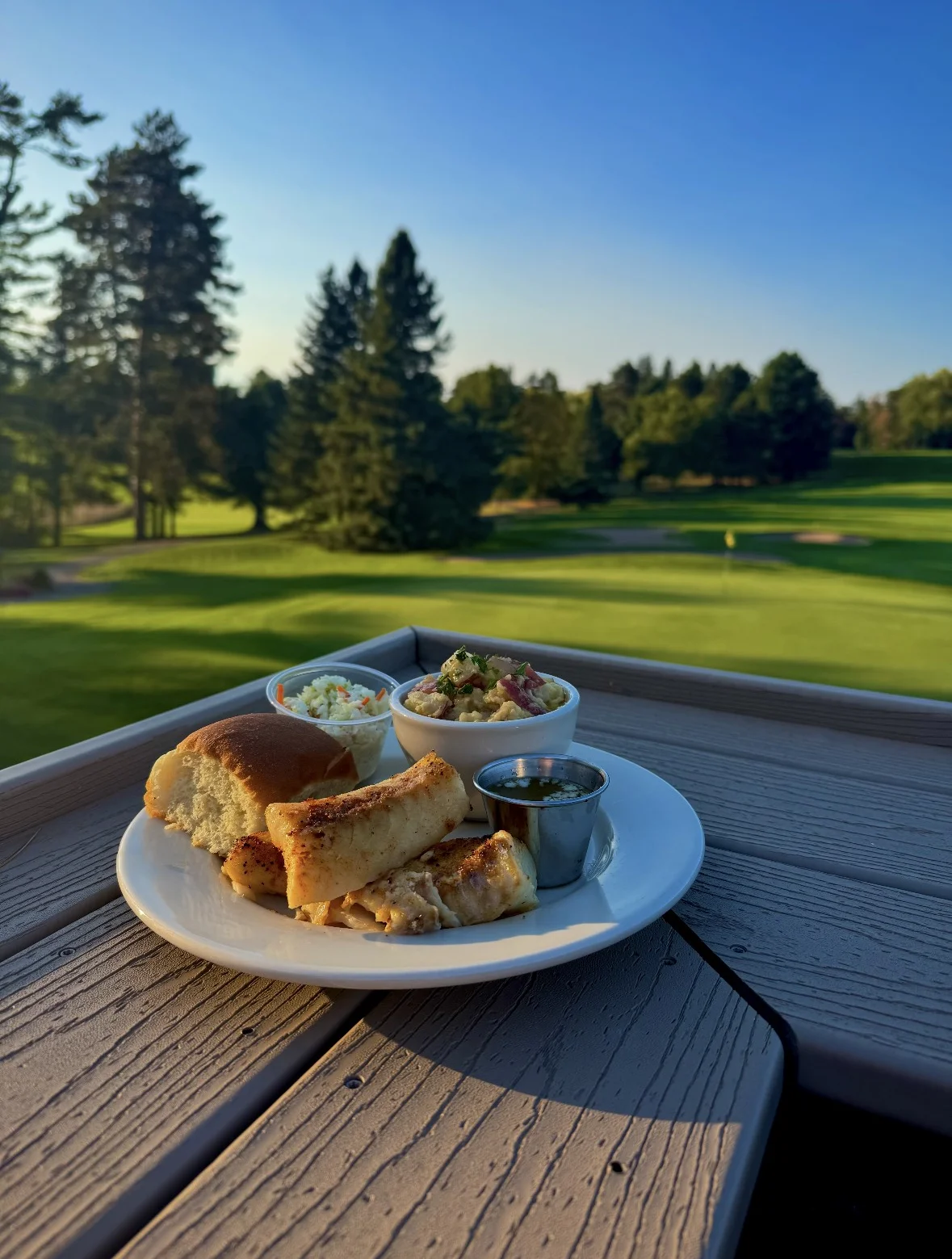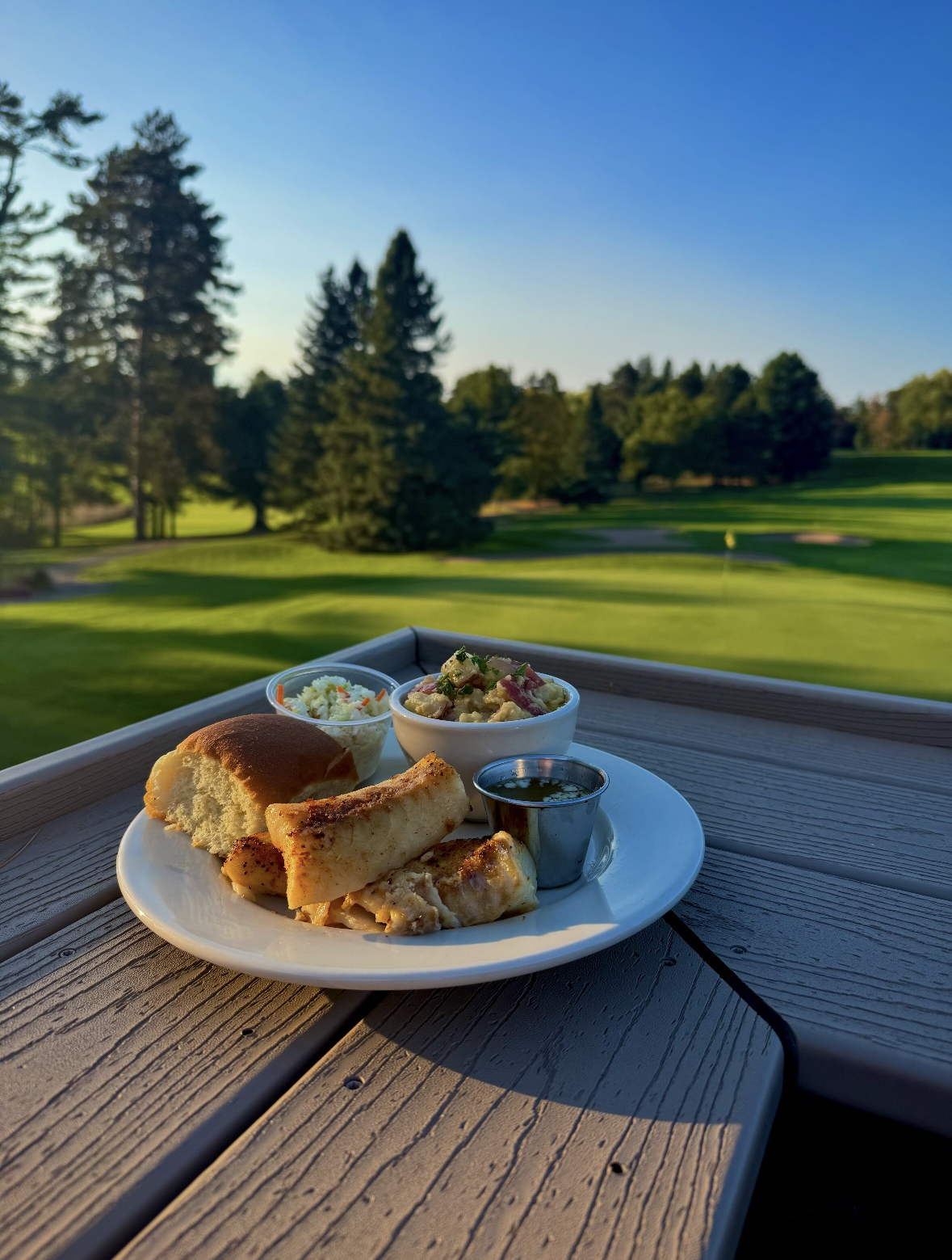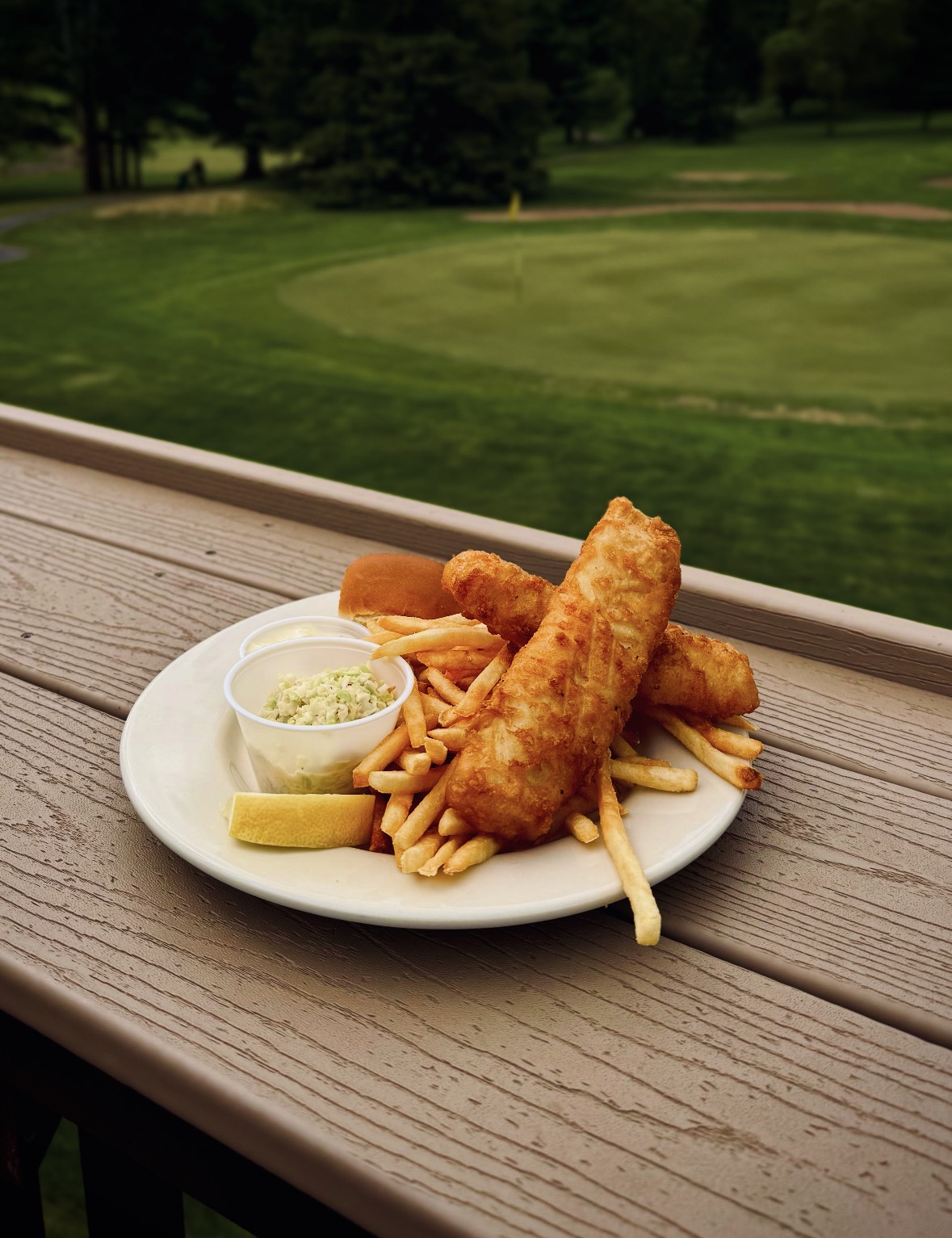 Enjoy golden, crispy fish fillets prepared to perfection, served with all your favorite fixings — coleslaw, fries, and fresh baked rolls. Relax in our welcoming clubhouse with great food, friendly service, and beautiful views of the course.